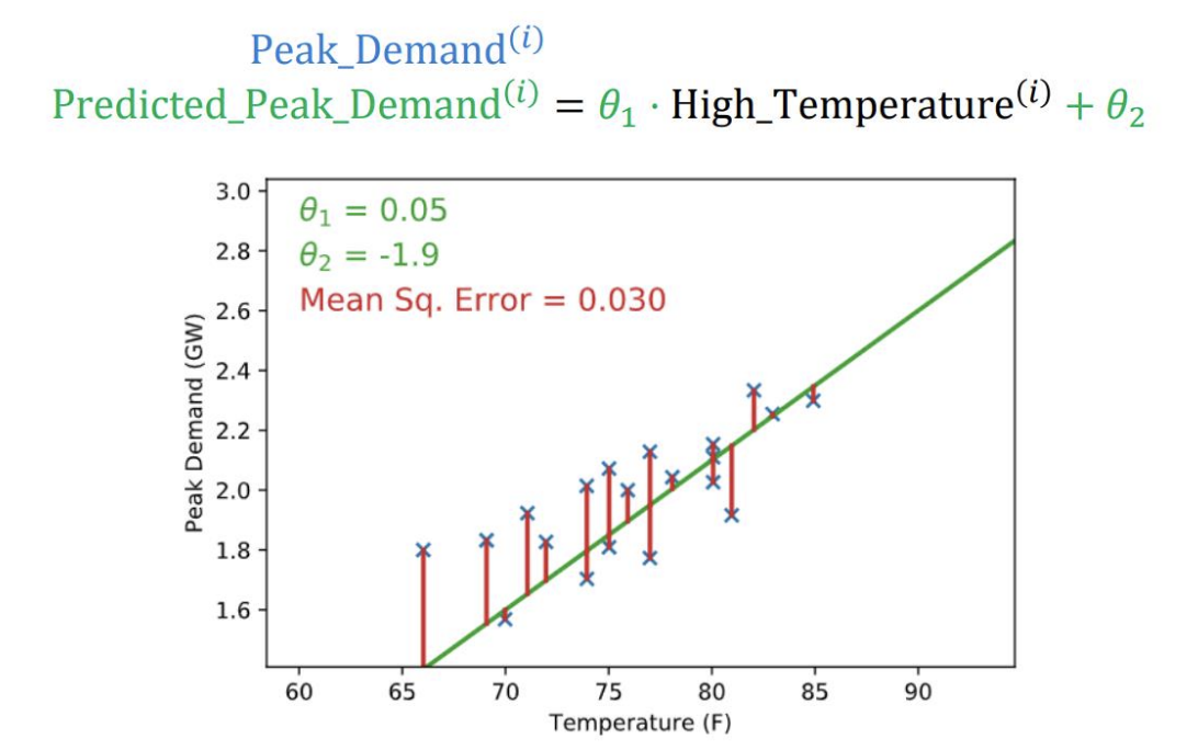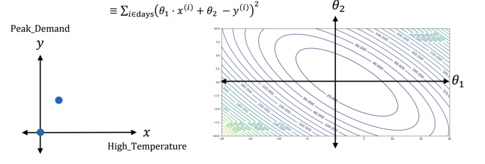E(\theta) = E(\theta_1, \theta_2) &= \sum_{i\in days}(\theta_1 \cdot \text{High_Temperature}^{(i)} + \theta_2 -\text{Peak_Demand}^{(i)})^2 \nonumber \newline &\equiv \sum_{i\in days}(\theta_1 \cdot x^{(i)} + \theta_2 - y^{(i)})^2\nonumber