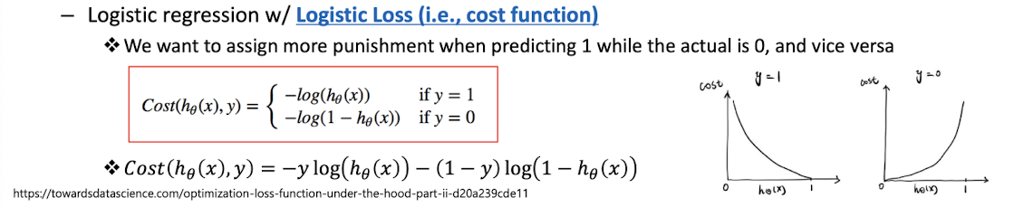 간단하게 y가 1일때 0에 가까우면 cost가 높고, 반대의 경우도 같은 형태로 계산된다.