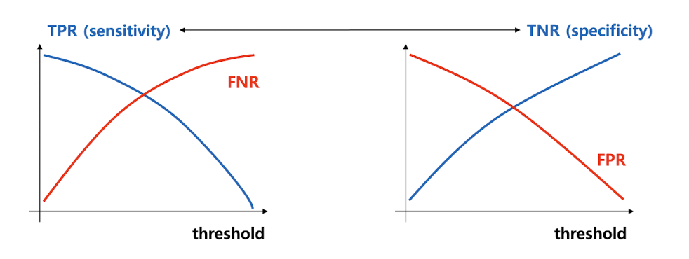 민감도 (Recall, sensitivity): 실제 1인 값을 모델이 얼마나 잘 1이라고 예측했는지